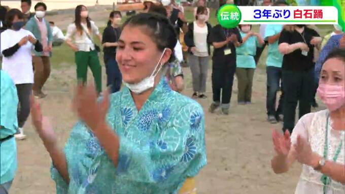 そして、着物や法被姿の島民らによる白石踊の披露です。島に暮らす人も、この日のために島に戻ってきた人も、歌と太鼓に合わせて踊ります。