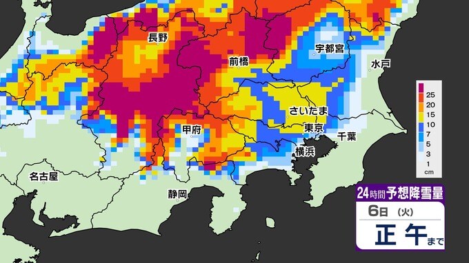 関東甲信地方では、5日昼過ぎから6日朝にかけて、山沿いや山地を中心に大雪となる所があるでしょう。予想より気温が低くなった場合には、警報級の大雪となる地域が広がる可能性があります。積雪や路面の凍結による交通障害に警戒・注意してください。また、ビニールハウスなどの倒壊、架線や電線、樹木への着雪に注意してください。なだれにも注意してください