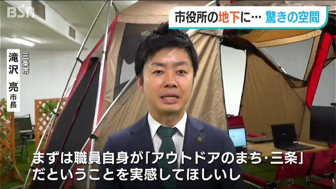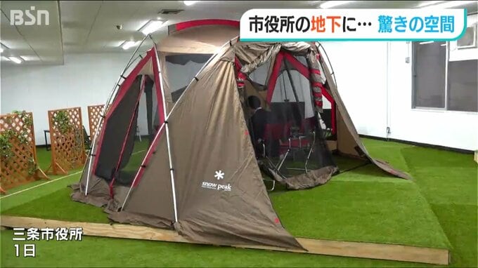 三条市役所の地下に現れたのは、大型テントが設置されたまるでキャンプ場のようなアウトドア空間。