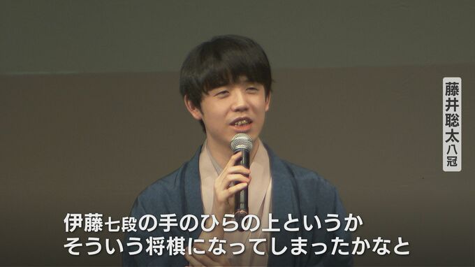 藤井八冠:「本局は早い段階から入玉を含みにするような展開になったんですけれど。こちらが工夫が足りなくて、結果としては、伊藤七段の手のひらの上というか、そういう将棋になってしまったかなと思っています。第二局まで少し期間が空くので、本局を振り返って、また次の対局に向けて準備をしていきたいと思います」