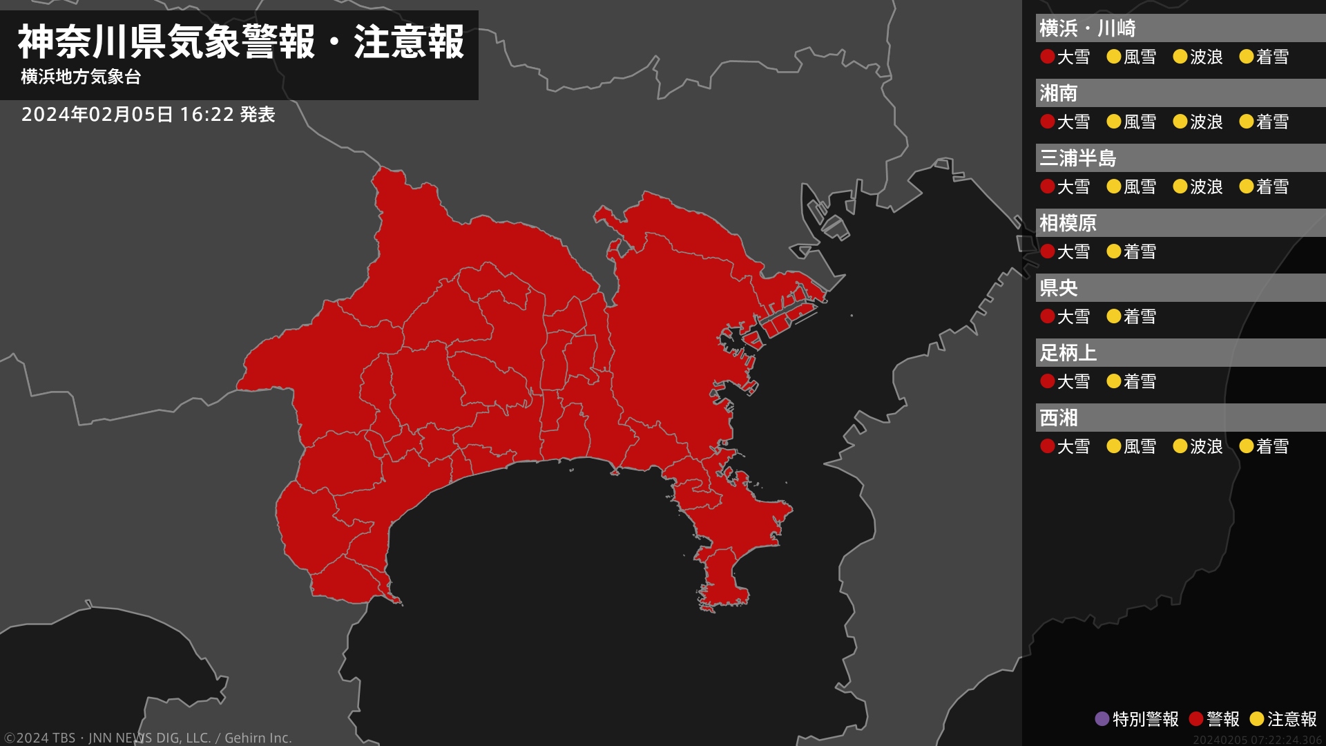 気象台は、午後4時22分に、大雪警報を横浜市、川崎市、相模原市、横須賀市、平塚市、鎌倉市、藤沢市、小田原市、茅ヶ崎市、逗子市、三浦市、秦野市、厚木市、大和市、伊勢原市、海老名市、座間市、南足柄市、綾瀬市、葉山町、寒川町、大磯町、二宮町、中井町、大井町、松田町、山北町、開成町、箱根町、真鶴町、湯河原町、愛川町、清川村に発表しました。