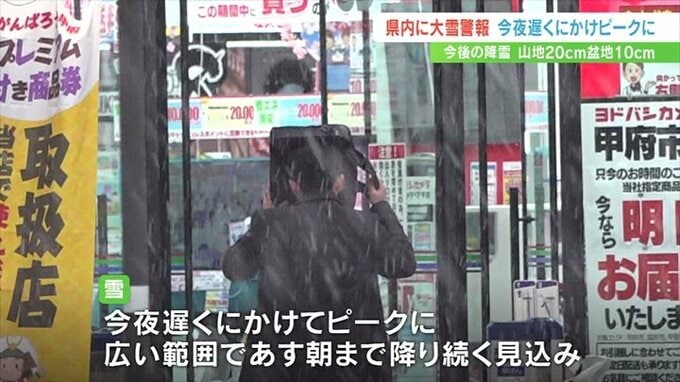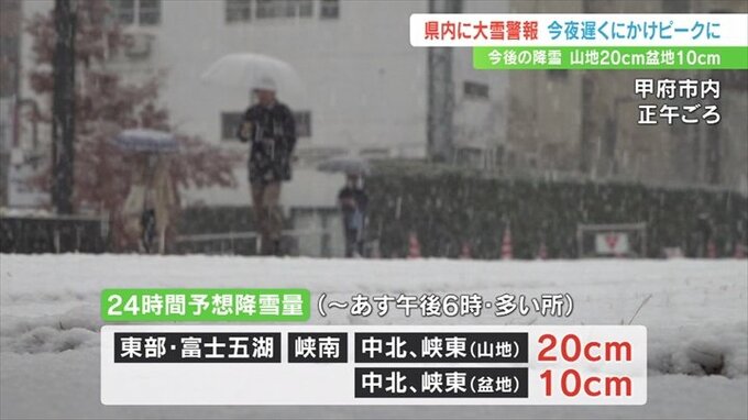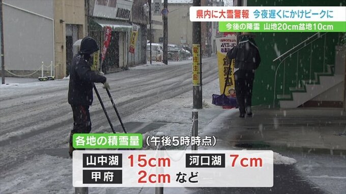 午後5時時点の各地の積雪は山中湖で15cm、河口湖で7cm、甲府で2cmなどとなっていて、5日午後4時過ぎ県内全域に「大雪警報」と「着雪注意報」、昭和町を除いて「なだれ注意報」が出されました。