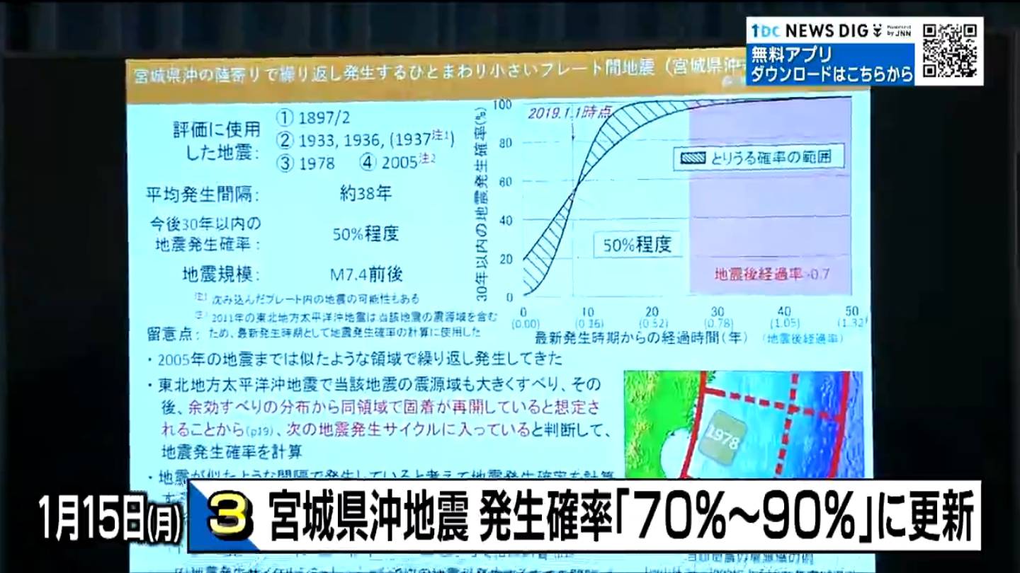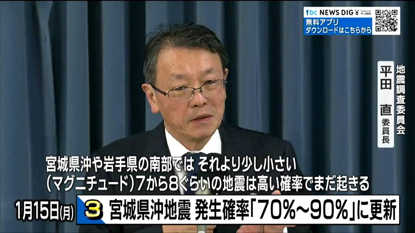 政府の地震調査委員会が公表した1月1日現在の全国の地震発生確率によりますと、宮城県沖でマグニチュード7.4前後の地震が今後30年以内に発生する確率は去年は「70~80%」でしたが今回「70~90%」に更新されました。