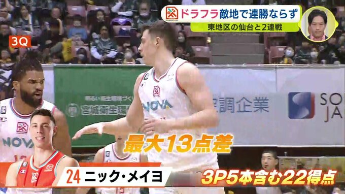 しかし、残り3分を切って逆に3ポイントを決められ、逆転負け。4連敗中の仙台に連勝とはなりませんでした。