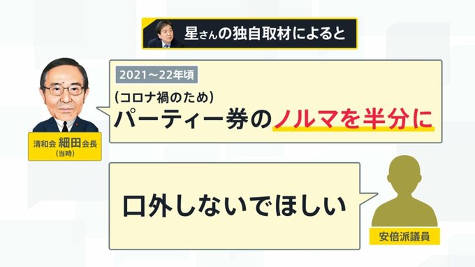 2021年~2022年頃、安倍派の中ではコロナ禍で政治資金パーティーを対面で開催することが困難になった。そこで当時、清和会の細田会長から「(コロナ禍のため)パーティー券のノルマを半分にしよう」という話が出たそう。パーティー券というのは、これは企業に売るものですが、ある議員は、「ノルマが半分になったということを口外しないで欲しい」と言ったそうです。