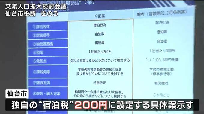 仙台市が検討を進めるホテルや旅館の宿泊料金に独自に税を上乗せする「宿泊税」についてです。5日の検討会議で市は、1泊200円とする案を示しました。その場合、市の試算では年間13億円の税収となり、観光施策の強化などに活用できるとしています。