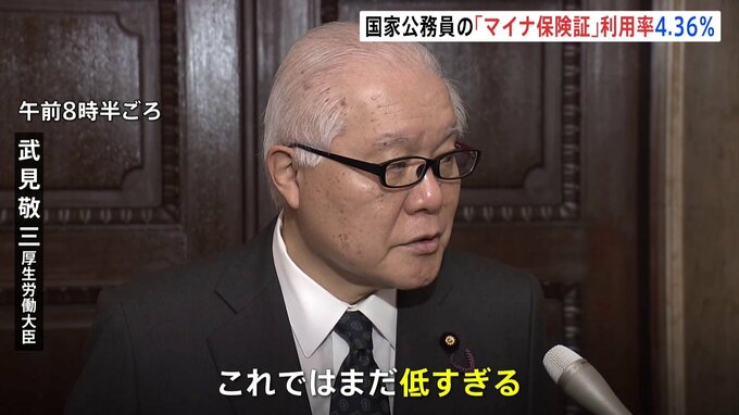 武見厚生労働大臣は、国家公務員の「マイナ保険証」の医療機関や薬局での利用率が4.36%にとどまることを明らかにしました。武見敬三厚生労働大臣「これではまだ低すぎる。もっと率先して使っていただくように働き…