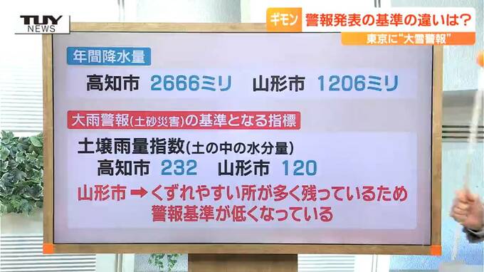 一方で山形市は、崩れやすい所が多く残っているため、警報基準が低くなっているということです。