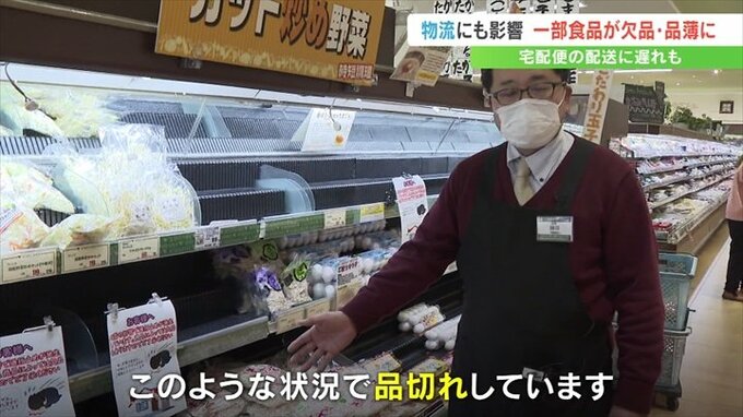 「こちらのもやしは県内産ですが、潤沢に入ってきている。ただし、こちらの商品は中央道を使って物流しているので、このような状況で品切れしています」