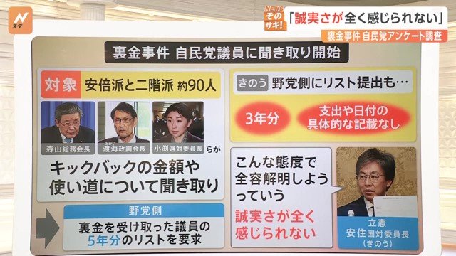 このリストは2月5日、野党側に提出されましたが、5年分ではなく、実際には3年分のリストだったということがわかっています。また、この内容に関しては訂正された金額、その団体、そして代表者が記載されていましたが、支出や日付の具体的な記載はありませんでした。