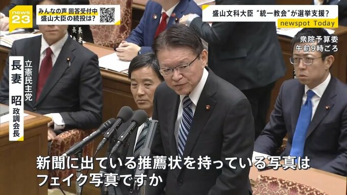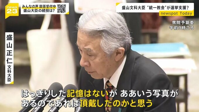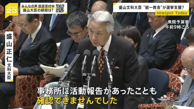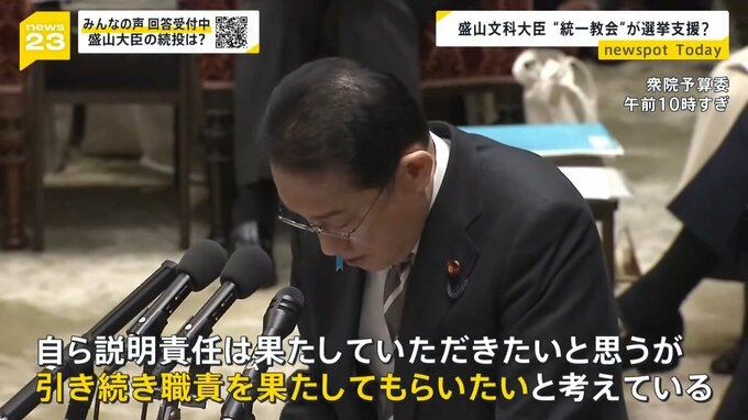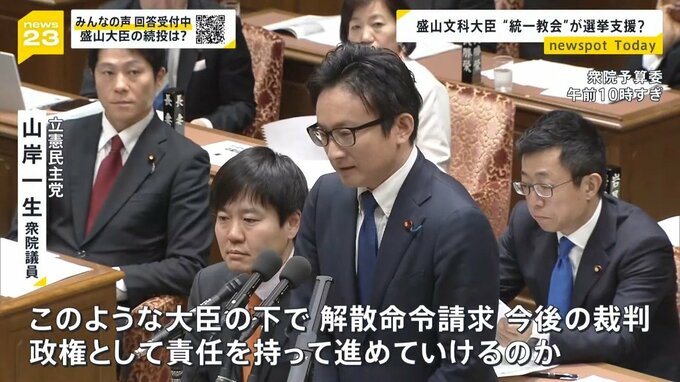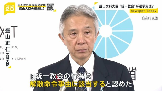 2023年、東京地裁に旧統一教会の解散命令を請求した盛山文部科学大臣。2021年の衆院選で、旧統一教会の関連団体である「世界平和連合」から推薦状を受け取り、選挙支援を受けていたと報じられたのです。