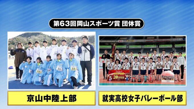 団体賞には、第31回全国中学校駅伝で史上2校目のアベック優勝を飾った京山中学校陸上部、第76回全日本高校選手権で2大会ぶり5度目の優勝を果たした就実高校女子バレボール部など3団体が選ばれました。