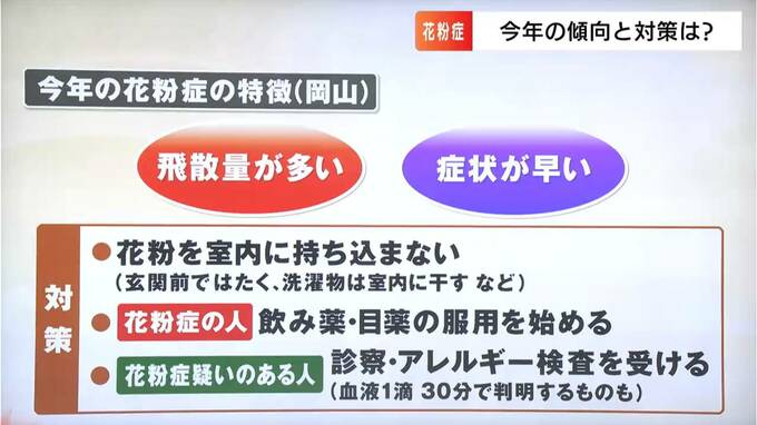 花粉症と分かっている人は、これまで服用し体に合った飲み薬を飲み始める、花粉症の疑いがある人は、まずは診察やアレルギー検査を受ける。(血液1滴でアレルギーが分かる検査もあります)