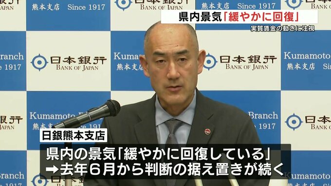 日本銀行熊本支店は金融経済概観を発表し、熊本県内の景気について緩やかに回復しているという判断を示しました。「緩やかに回復している」という判断は去年6月から据え置かれている状況が続いています。新型コロ…
