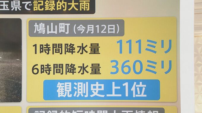 とりわけ雨が多かったのが鳩山町です。1時間の降水量はなんと111ミリ、6時間降水量も360ミリといずれも観測史上1位の記録だということです。