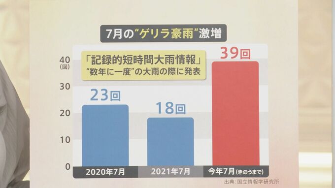 この雨を受けて、埼玉県内では数年に一度くらいの大雨が降るときに発表される「記録的短時間大雨情報」が4時間ほどで9回も発表されたということです。この「記録的短時間大雨情報」は数年に一度と言われていますが、近年とくらべてどうなのでしょうか?2022年の7月(17日まで)、2021年の7月、2020年の7月で「記録的短時間大雨情報」の発表回数を比べました。