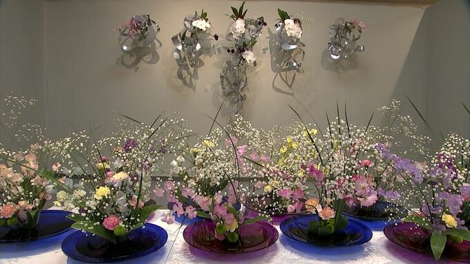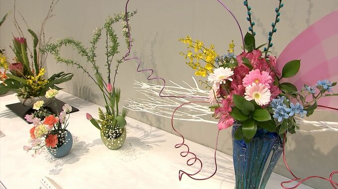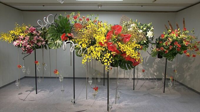 岡山県華道連盟に加盟する県内の17流派による華道展が岡山市で始まりました。