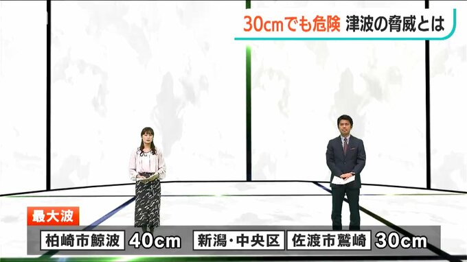 一方、能登半島地震では柏崎市で40cm、新潟市中央区と佐渡市鷲崎で30cmの津波が観測されました。30センチというと、ひざより低い高さです。