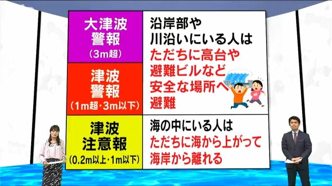 予想される高さが3m以下の場合に出されるのが『津波警報』、3mを超える場合に出されるのが『大津波警報』です。『警報』が出た場合、沿岸部や川沿いにいる人は、ただちに高台や避難ビルなど安全な場所へ避難してください。
