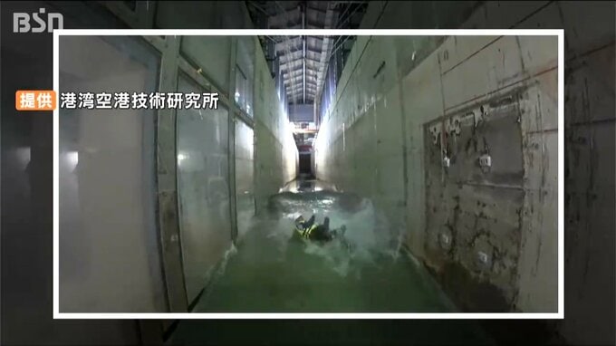 30cmの津波を再現した実験映像では、大人の男性が立っていられないほどの威力でロープにしがみつくのがやっという状態です。