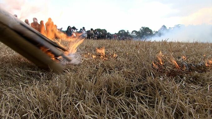 たいまつで火が付けられると冬枯れの芝が黄金色から漆黒へと変わっていきます。