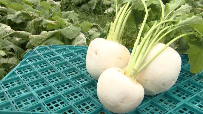 博多カブを生産する農家の牛尾邦彦さん(50)によると、畑のすぐ横に川が流れる影響で土が柔らかく、優しい甘さが特徴のカブに育つそうです。葉までおいしく食べられるため、実がきれいでも葉が傷んでいるものは出荷しないほどこだわっていますが、食卓に登場する頻度が低いことが悩みだといいます。