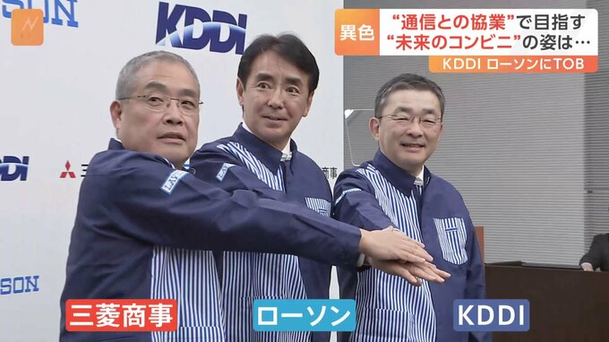 KDDIによる株式の公開買い付けを発表したローソン。通信大手とコンビニ大手の“異色の協業”で目指す「未来のコンビニ」とは…。ローソンの制服を着て写真撮影にのぞんだローソンと親会社の三菱商事、KDDIのトップ…