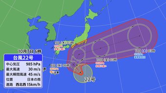 【台風情報】台風22号(ハーロン) 目が “くっきり” 9日午前に勢力のピーク「950hPa」で近畿・東海の太平洋沿岸部に近づく予想 気象庁発表(7日午前7時 記事更新)