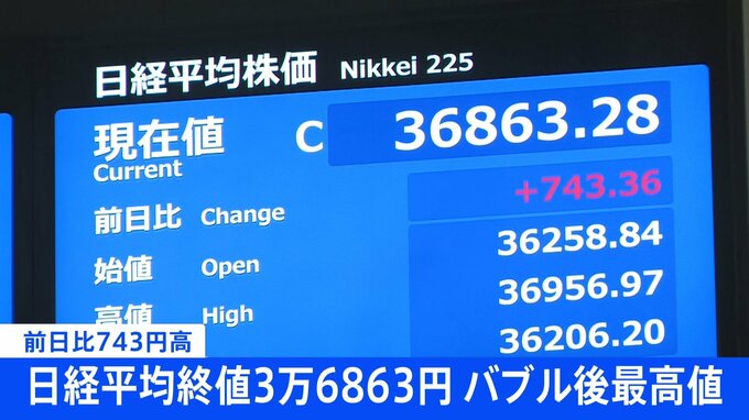 きょうの東京株式市場で日経平均株価は、きのうより743円高い3万6863円で取引を終え、バブル後の最高値を更新しました。7日のニューヨーク株式市場でダウ平均株価が史上最高値を更新した流れを引き継ぎ、半導体関…