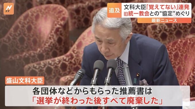 国会では、旧統一教会の関連団体と盛山文部科学大臣との接点をめぐり野党側の追及が続いていて、盛山大臣は「確認できていない」「覚えていない」などと繰り返しました。きょうの衆議院予算委員会で野党側は、盛山…