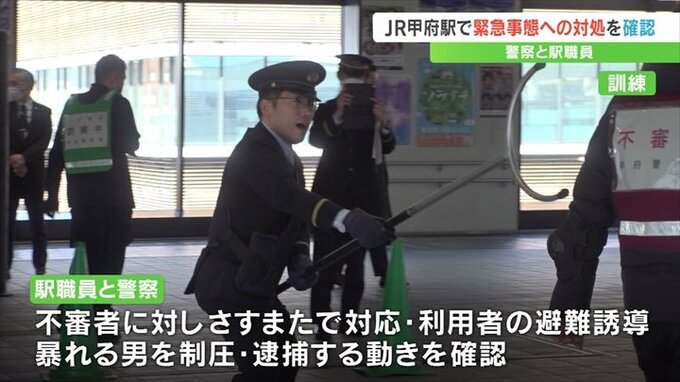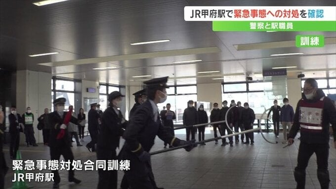 JR甲府駅で、警察と駅の職員合同で刃物を持った不審者に対応する訓練が行われました。