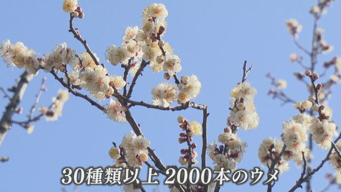 東京ドーム1個分の敷地にシダレウメやロウバイなど30種類以上、2000本が植えられ、早咲の品種がほころび始めました。