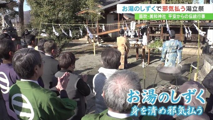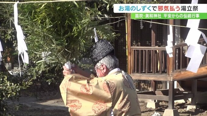 笹の葉に浸したお湯のしずくで邪気を払う湯立祭が、山梨県笛吹市の神社で行われました。