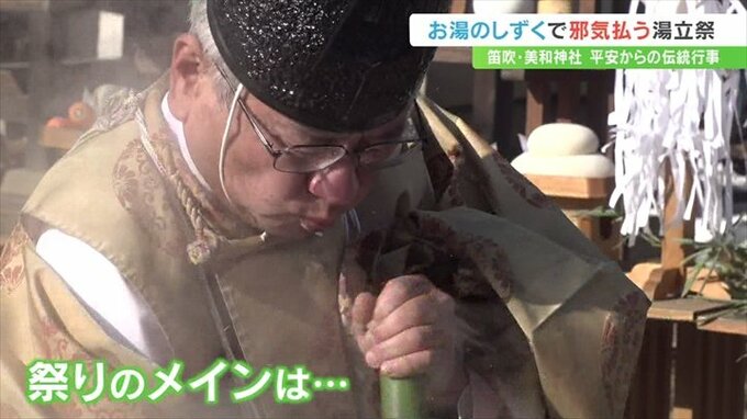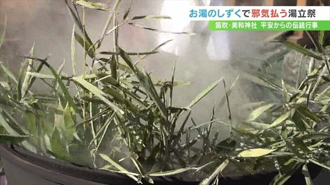 ぐつぐつと煮えたぎるお湯に宮司が笹の葉を突っ込み、辺り一面に振り払います。