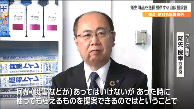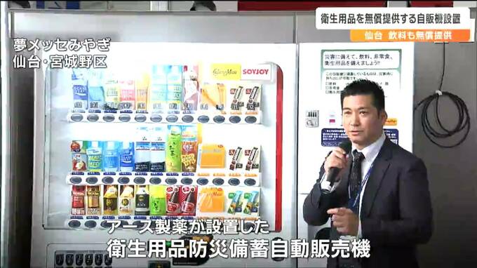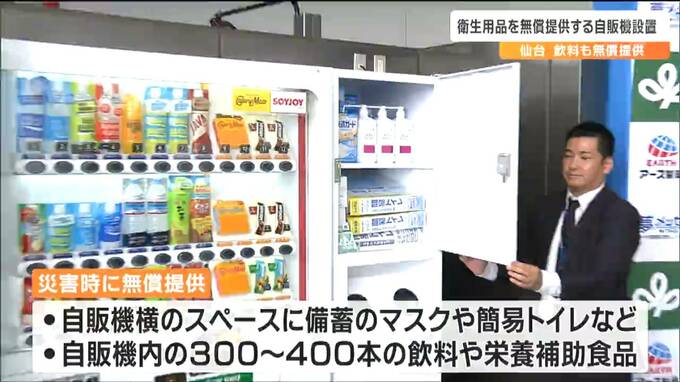 災害時にマスクや簡易トイレなどの衛生用品を無償で提供する自動販売機が8日、仙台市内に設置されました。自販機内の飲み物なども災害時に無償で提供されます。