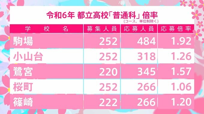 都立高校入試2024 志願倍率は日比谷1.84倍、西1.71倍、国立1.61倍に【令和6年度高校受験 進路希望調査】 TBSテレビ 2024年2月8日(木) 20:28 国内 学校別の一覧 駒場1.92倍、小山台1.26倍