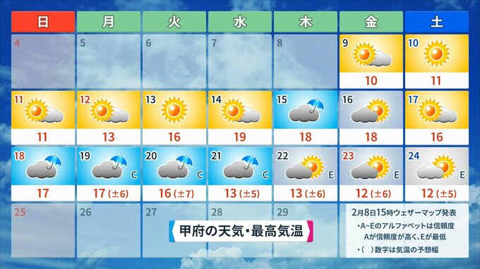 甲府の予想最高気温は10℃、10℃まで達すると6日ぶりに2桁の気温となります。