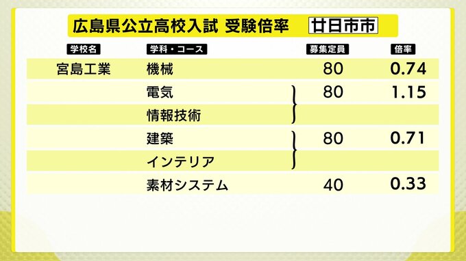 広島県公立高校入試2024 志願倍率は基町1.41倍 舟入0.98倍 国泰寺1.60倍に 平均志願倍率1.02倍 令和6年度入学者一次選抜志願状況【全校掲載】(9日現在) 中国放送 2024年2月9日(金) 18:43 国内 廿日市1.08倍 廿日市西0.96倍 宮島工業(電気・情報技術)1.15倍