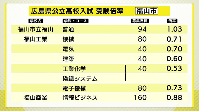 広島県公立高校入試2024 志願倍率は基町1.41倍 舟入0.98倍 国泰寺1.60倍に 平均志願倍率1.02倍 令和6年度入学者一次選抜志願状況【全校掲載】(9日現在) 中国放送 2024年2月9日(金) 18:43 国内 福山誠之館1.47倍 福山葦陽1.28倍 大門1.03倍 神辺旭0.76倍
