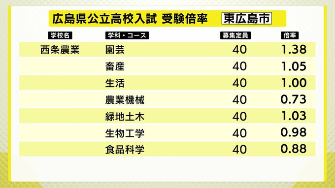広島県公立高校入試2024 志願倍率は基町1.41倍 舟入0.98倍 国泰寺1.60倍に 平均志願倍率1.02倍 令和6年度入学者一次選抜志願状況【全校掲載】(9日現在) 中国放送 2024年2月9日(金) 18:43 国内 賀茂1.16倍 大竹0.69倍 西条農業(園芸)1.38倍