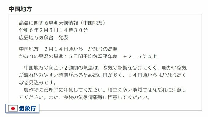 「早期天候情報」は、その時期としては“10年に一度レベル”しか起きないような著しい高温や低温、降雪量となる可能性が、いつもより高まっている時に注意を呼びかけるために出される情報です。その現象が予想される6日前までに発表されます。