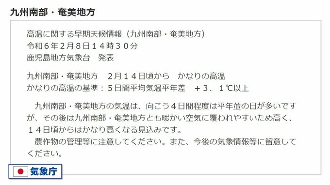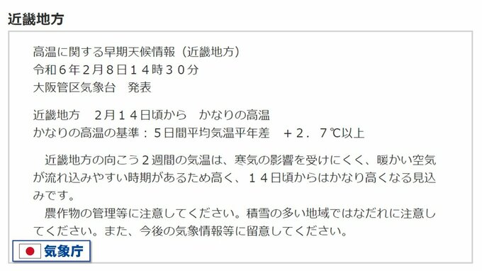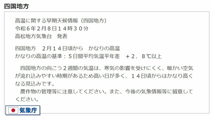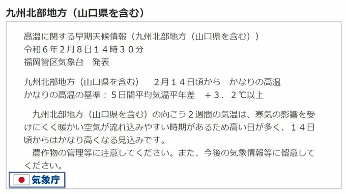 来週は全国各地 “4月の陽気” 東京20℃・沖縄25℃「夏日」予想 全国に「高温に関する早期天候情報」発表 気象庁 一気に花粉飛散本格化へ 中国放送 2024年2月9日(金) 12:16 国内 今回発表の「高温に関する早期天候情報」の詳細(西日本)