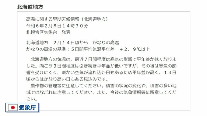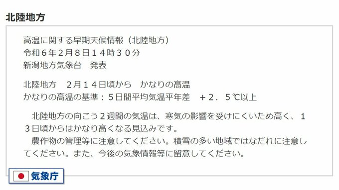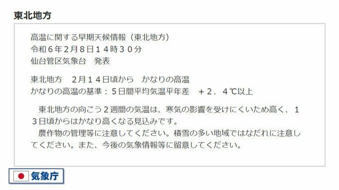 来週は全国各地 “4月の陽気” 東京20℃・沖縄25℃「夏日」予想 全国に「高温に関する早期天候情報」発表 気象庁 一気に花粉飛散本格化へ 中国放送 2024年2月9日(金) 12:16 国内 今回発表「高温に関する早期天候情報」の詳細(東・北日本)