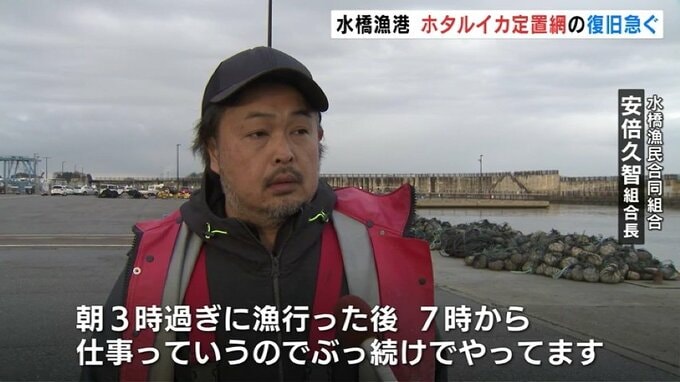 「富山湾の神秘」として知られるホタルイカ。3月1日のホタルイカ漁解禁を前に、富山市の漁港では、能登半島地震で壊れた定置網の復旧作業が急ピッチで進められています。富山市の水橋漁港では、能登半島地震で、5…
