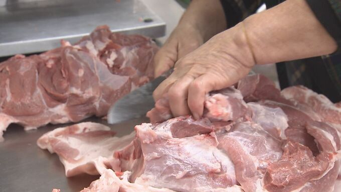 精肉店では、中身汁用の中身を洗ったり、豚肉を処理したりと、作業に追われていました。