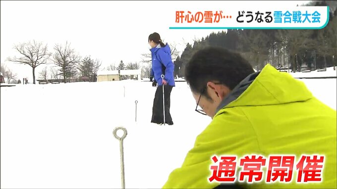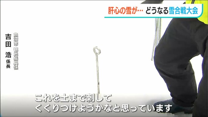 【記者りリポート】「こちらは雪合戦の会場です。例年重機で踏み固めていますが、今年は雪不足で踏み固めることができず、このように歩いているとズボズボと足が埋まってしまいます」