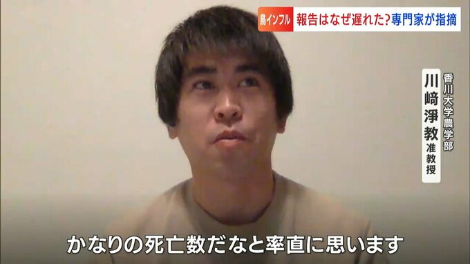 香川大学の川崎准教授は、死んだニワトリの数が2倍を超えて、1週間近く経過してからの報告は問題だと話します。
