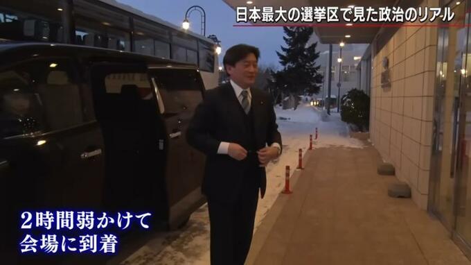 冬の北海道では雪の影響で飛行機が飛ばないなど予定がずれることもよくあるというが、この日はアクシデントもなく武部議員は2時間弱で会合の場へ到着。