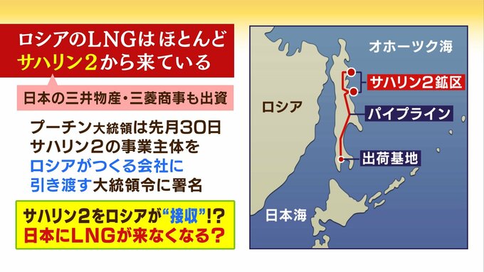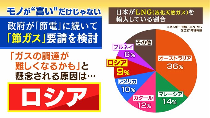 ―――ただ、実は値上がりというのは“モノ”だけではないようですね?「政府が『節電』に続いて『節ガス』の要請も検討していると。ガスの調達が難しくなるかもと実は心配されています。その原因はロシアにあります。ガスはそのまま海外から持ってくるとものすごく体積が大きいので、液化天然ガスという無理やり圧力をかけて冷凍にして液体にするんですよね。それを『LNG』と言います。液化天然ガス・LNGにして、専用のタンカーで日本に運んできます。日本がLNGを一番輸入している国はオーストラリアで全体の36%、それからマレーシア、カタール、アメリカ、ロシア、ブルネイと続いています。ロシアからは9%のLNGを輸入してるんですが、これが入って来なくなるかもしれないということが心配されています。このロシアからのLNGというのは、『サハリン2』というところから来ています。サハリンというそもそもの天然ガスが取れる場所に“会社”があってですね、その2つ目の会社がサハリン2というんですね。大体、日本が輸入しているロシアからのLNGのほとんどはこのサハリン2から来ているんですね。パイプラインで出荷基地まで運んで、出荷基地から日本に送ると。日本とロシアの関係が良かった頃は、パイプラインをそのまま日本まで引いて、『LNGにしなければコストが安くていいんだ』なんて話をしてたこともあったんですけど、今はそうではないわけですね。このサハリン2という会社、正式にはコンソーシアムといいますが、まぁ会社だと思ってください、そこに日本の『三井物産』と『三菱商事』も出資してるんですよね。金を出してるわけです。だから、そこから長期契約で天然ガスが手に入るということになっていたんですね。ところがですね、プーチン大統領が6月30日、『サハリン2の事業主体をロシアがつくる会社に引き渡す』という大統領令に署名をしたんですね。つまり、これからはロシアがつくる会社で全部やるんだよ、ということになっちゃったんですよね。サハリン2などの会社が全部ロシアの会社になってしまうと、LNGが来なくなるかもしれないということなんです」