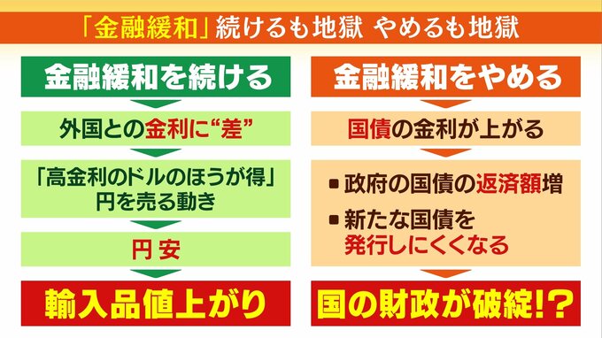―――金融緩和を続けるべきか、やめるべきか。比べてみるとどうなのでしょうか?「なんで金融緩和をやっていたかというと、いわゆるアベノミクスですよね。とにかく金融緩和をすれば、金利を下げれば円安になるでしょ。そうすると輸出にはものすごく利益があるわけですよ。例えば自動車産業だったりすると、円安になると海外でこれが安くなるので、それによって日本の経済を良くするということをしてきたんですね。これまでは結構良かったんですけど、金融緩和を続けると、今後は外国との金利にさらに差が出てくるということになると、みんな『高金利のドルの方が得だ』と円を売る動き、円安になる。輸入品がどんどん値上がりをする。つまり、これまでアベノミクスはそれなりの効果があって良かったんですよね。でもこれだけの差がついてしまうと円安になり、輸出にはいいんですけど輸入品がみんな値上がりをする。石油も買っているわけでしょ。石油の価格も円安ですから高くなるわけですよね。そうするとありとあらゆるものが値上がりすることになっていく。プラスチック製品は全部これ石油製品ですから、私たちの身の回りのプラスチック製品もみんな値上がりしてしまう。でも、じゃあ金融緩和をやめたらどうなるのか。今、景気を良くしようとして金融緩和をしているわけですから、逆に金融緩和をやめちゃうと景気がまだまだ当分良くならないってことになる。さらに、結局、金融緩和をやめるということは金利を上げるということですよね。そうすると日本は国債を発行してますよね。国の借金ですよね。今はこれは非常に低い金利で国債が発行できているんですけど、金利が上がるということは、日本が国債を発行するときの利子が、返済額が増えてしまう。ということは新たな国債を発行しようとしても『金利が高いよね。借金返済するときにはちょっとこれじゃできないよね』ということになり、これまで大量の国債を発行しているわけですけれども、新たに国債が発行できなくなると財政状態が大変な状態になってしまうというわけで、国の財政が破綻っていうのはちょっと大げさですけど、国の財政がかなり厳しくなる危険性があるってことですよね」